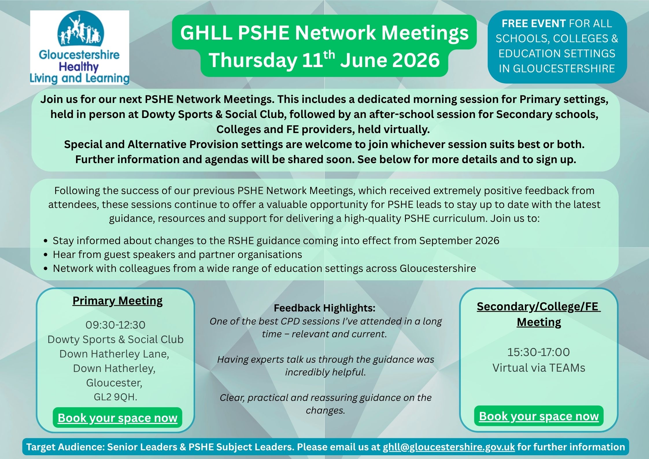 New for 2025-2026 GHLL are holding PSHE Network Meetings for both Primary and Secondary (Special and APS may choose to attend either, or both sessions, as appropriate).